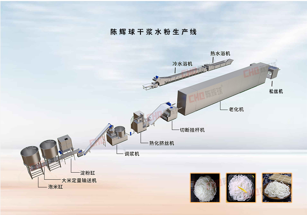 工藝流程:大米--洗米--飽和泡米--瀝水--粉米混和--磨粉--調漿--熟化擠絲--切斷掛桿--老化--松絲--熱水浴--冷水浴--干漿水粉